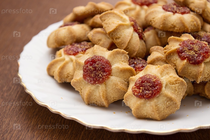 Печенье курабье на белой тарелке на деревянном столе. закрытый крупным планом