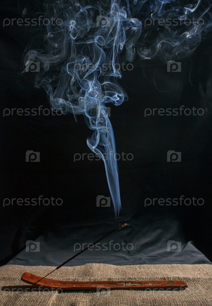 Индийская ароматическая палочка с дымом на черном фоне в помещении крупным планом