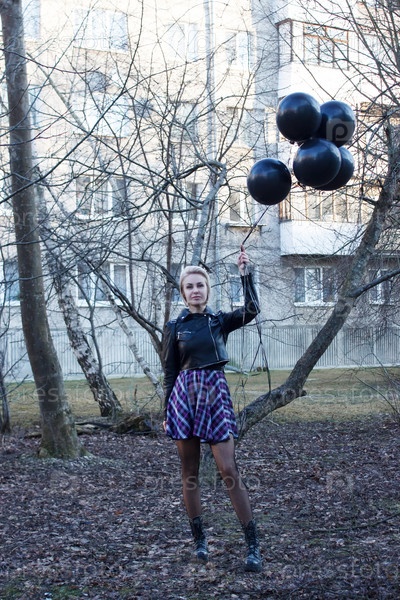 Женщина, держащая несколько воздушных шаров, празднует свой день рождения в весенний день