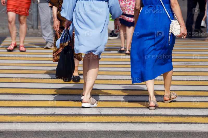 Люди переходят дорогу по пешеходному переходу. ноги крупным планом. на открытом воздухе в солнечный летний день