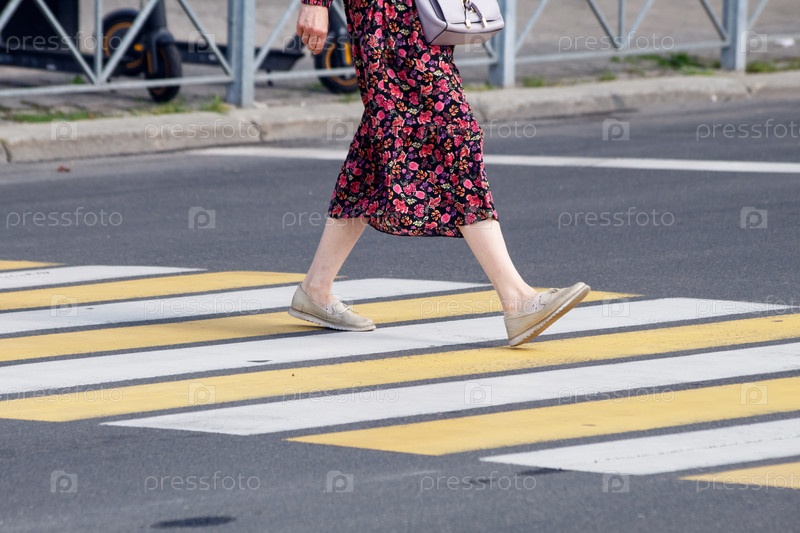 Люди переходят дорогу по пешеходному переходу. ноги крупным планом. на открытом воздухе в солнечный летний день