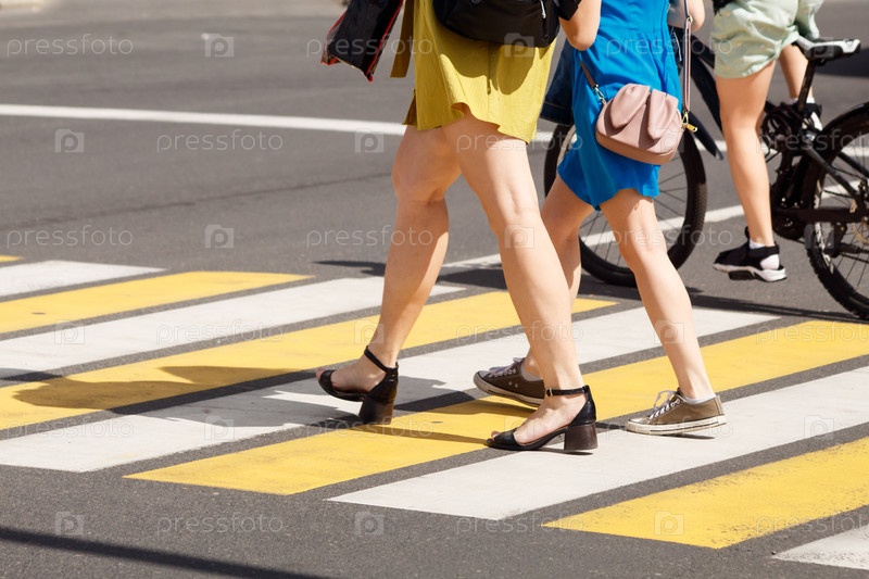 Люди переходят дорогу по пешеходному переходу. ноги крупным планом. на открытом воздухе в солнечный летний день