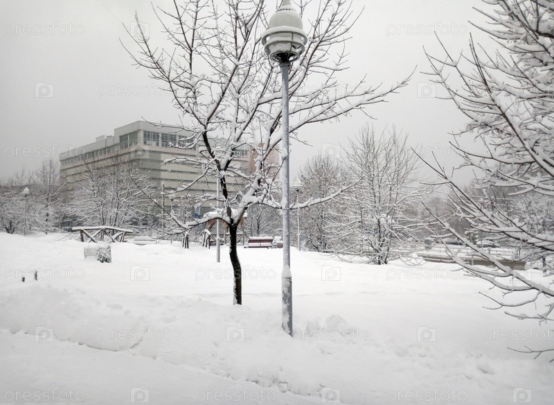 Городской парк после снегопада днем