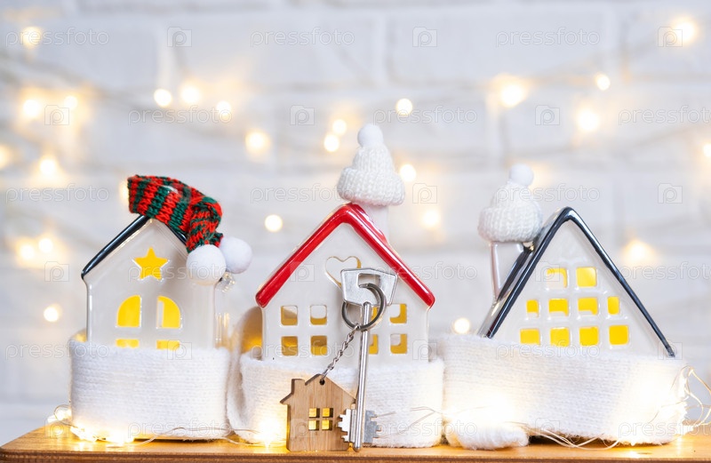 Ключ от дома с брелоком на уютном доме с рождественским декором. Подарок на Новый год, Рождество. Строительство, дизайн, проект, переезд в новый дом, ипотека, аренда и покупка недвижимости