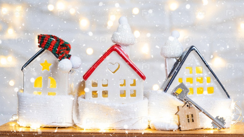Ключ от дома с брелоком на уютном доме с рождественским декором. Подарок на Новый год, Рождество. Строительство, дизайн, проект, переезд в новый дом, ипотека, аренда и покупка недвижимости