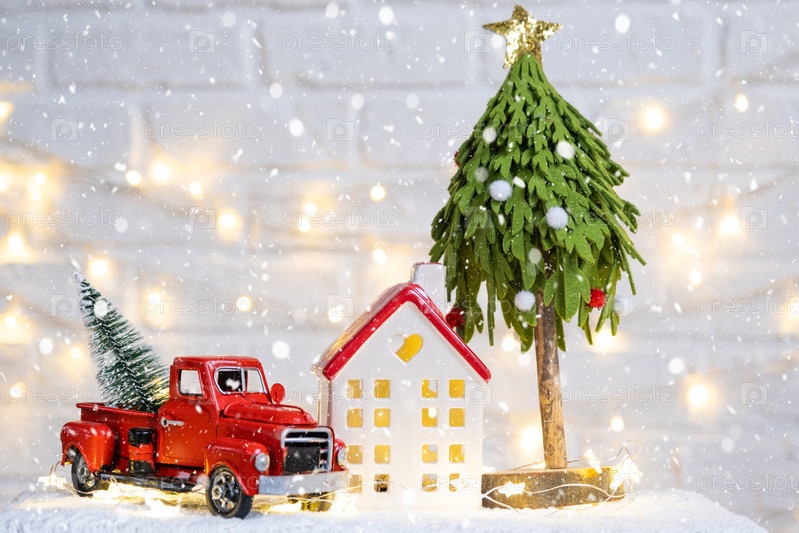 Рождественский декор красный ретро-пикап на снегу с волшебными огнями в боке Рождественская елка. Новогодняя открытка. Уютный дом