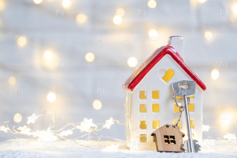 Ключ от дома с брелоком на уютном доме с рождественским декором. Подарок на Новый год, Рождество. Строительство, дизайн, проект, переезд в новый дом, ипотека, аренда и покупка недвижимости