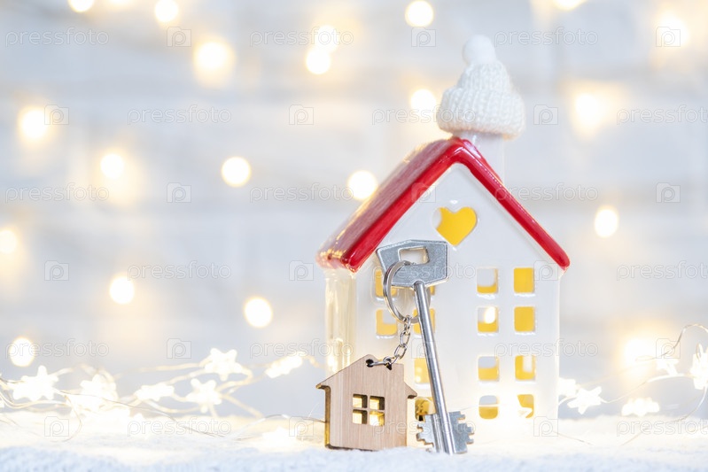 Ключ от дома с брелоком на уютном доме с рождественским декором. Подарок на Новый год, Рождество. Строительство, дизайн, проект, переезд в новый дом, ипотека, аренда и покупка недвижимости