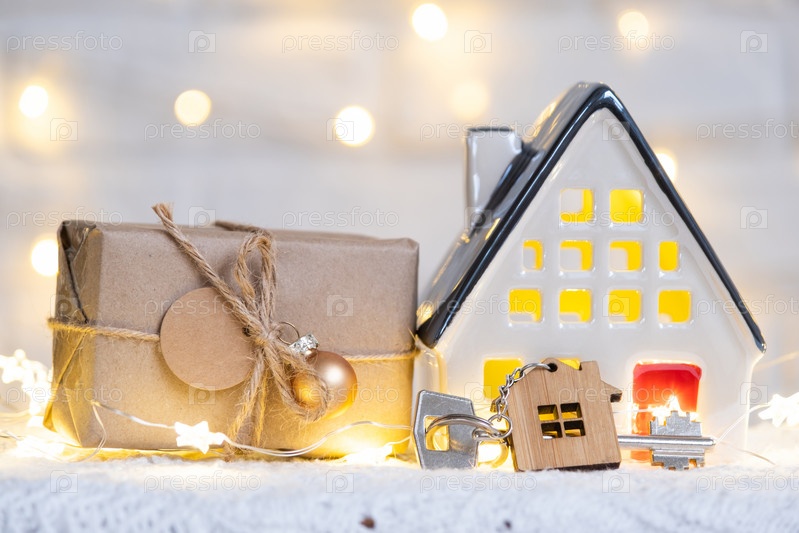 Ключ от дома с брелоком на уютном доме с рождественским декором. Подарок на Новый год, Рождество. Строительство, дизайн, проект, переезд в новый дом, ипотека, аренда и покупка недвижимости
