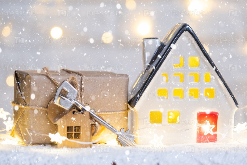 Ключ от дома с брелоком на уютном доме с рождественским декором. Подарок на Новый год, Рождество. Строительство, дизайн, проект, переезд в новый дом, ипотека, аренда и покупка недвижимости