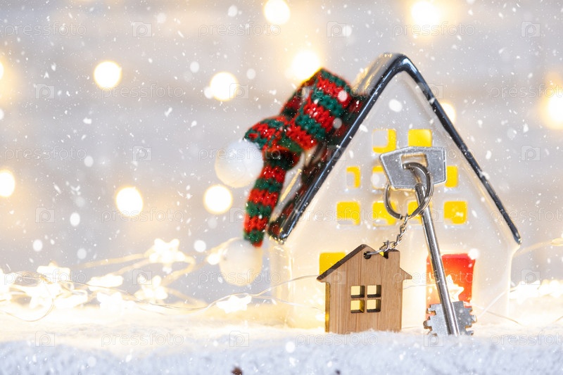 Ключ от дома с брелоком на уютном доме с рождественским декором. Подарок на Новый год, Рождество. Строительство, дизайн, проект, переезд в новый дом, ипотека, аренда и покупка недвижимости