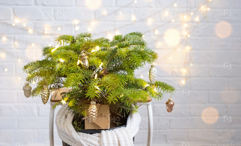 Комнатная натуральная ель в горшке украшена шарами наподобие елки с гирляндами. Подарочные коробки с натуральным декором к Новому году и Рождеству. Экологичный, ноль отходов, домашнее растение, зеленый дом
