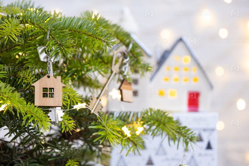 Ключ от дома с брелоком висит на елке. Подарок на Новый год, Рождество. Строительство, дизайн, проект, переезд в новый дом, ипотека, аренда и покупка недвижимости. Копировать пространство