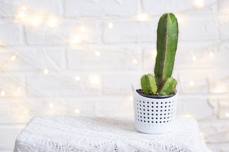Забавный кактус в форме мужского полового члена в гирляндах, завернутый в теплый, рождественский и новогодний декор. Без подарков праздника не будет. Интимная депиляция для мужчин. Комнатные растения в горшках, домашний декор