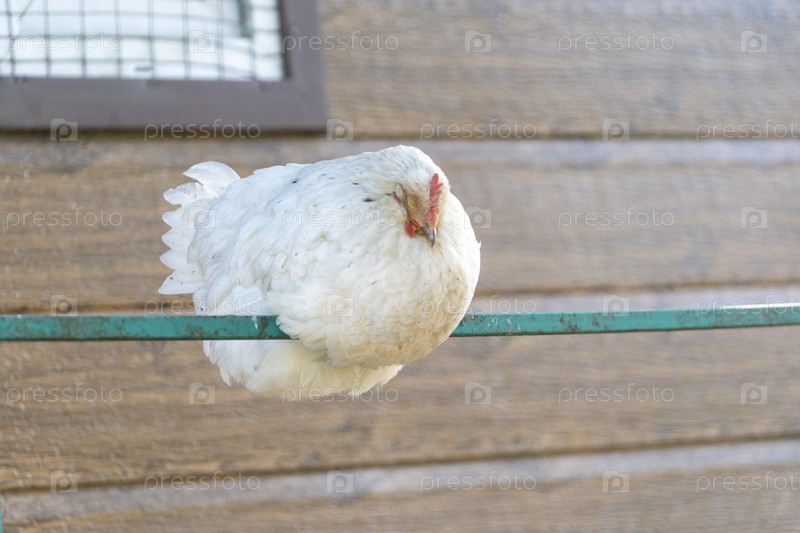 Портрет белого цыпленка, спящего на металлическом заборе