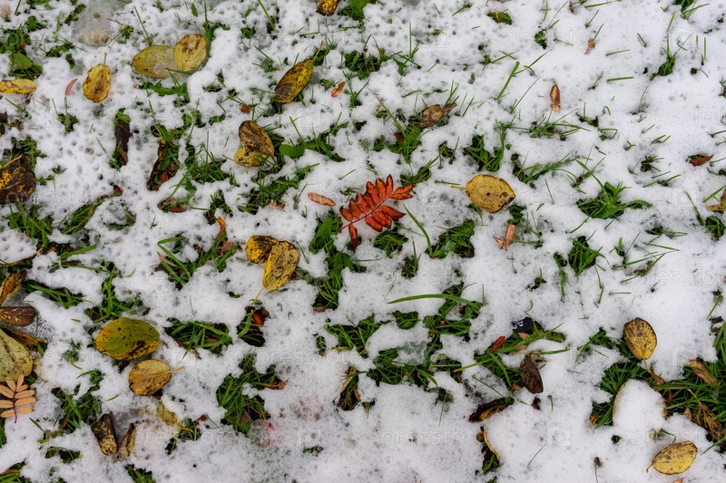 Естественный фон с травой, листьями и снегом