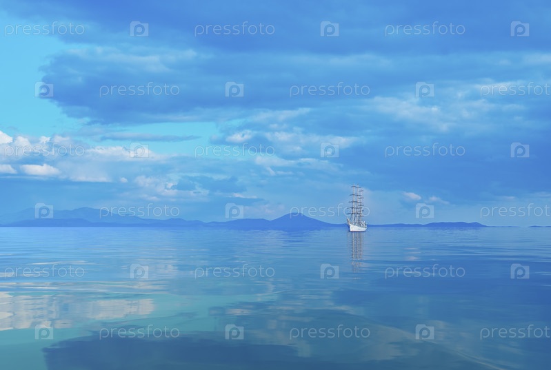 Морской пейзаж с красивым парусником на горизонте