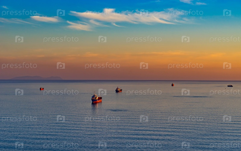 Морской пейзаж с танкером и кораблями на фоне моря и береговой линии