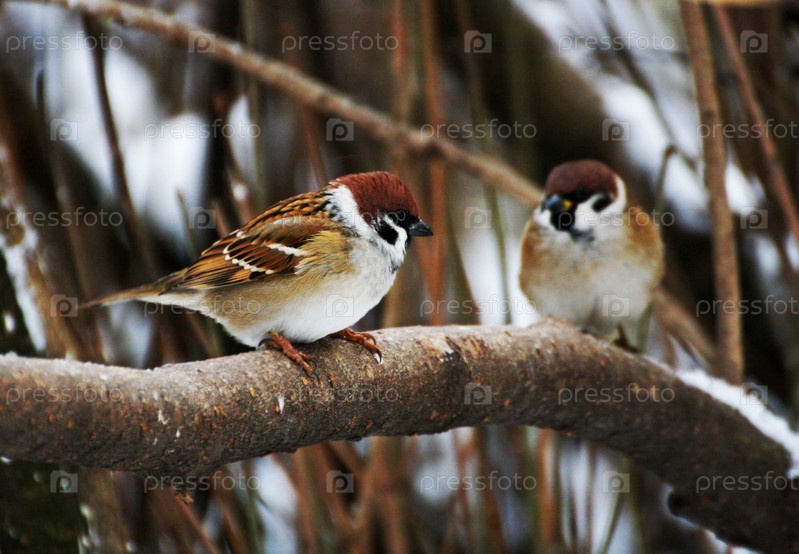 Два воробья сидят на ветке дерева