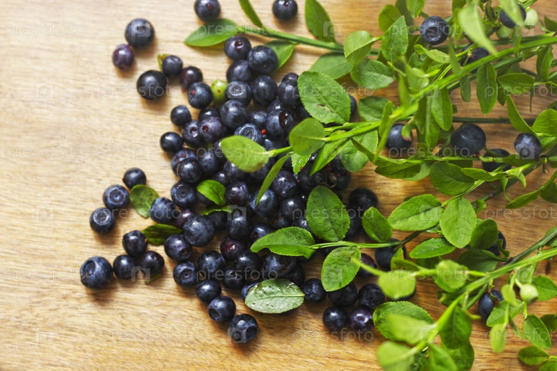 Спелая черника разбросана по деревянному столу среди зеленых листьев