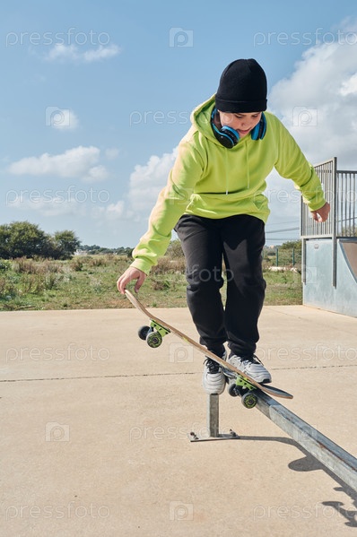 Молодой, подросток, со скейтбордом, сидящим на дорожке, в наушниках
