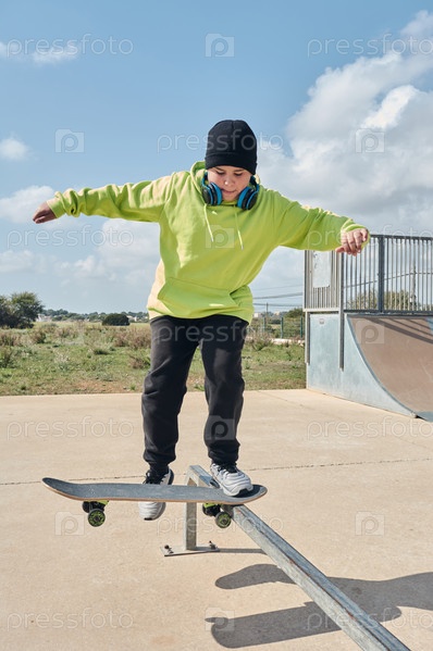 Молодой, подросток, со скейтбордом, сидящим на дорожке, в наушниках