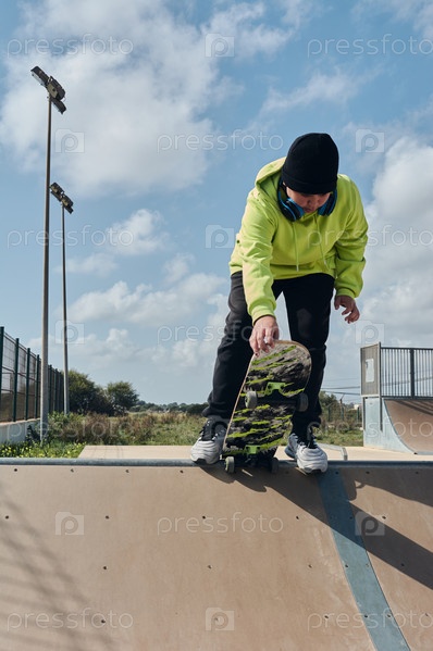 Молодой, подросток, со скейтбордом, сидящим на дорожке, в наушниках