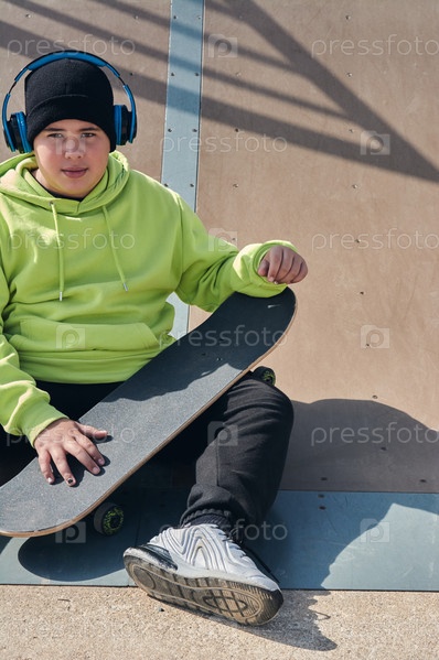Молодой, подросток, со скейтбордом, сидящим на дорожке, в наушниках