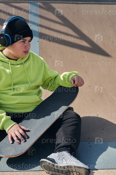 Молодой, подросток, со скейтбордом, сидящим на дорожке, в наушниках