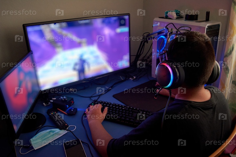 Вид сбоку подростка-геймера, играющего в онлайн-видеоигры на компьютере в темной комнате, в наушниках с микрофоном и с красочной клавиатурой с подсветкой