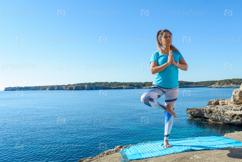Фитнес-женщина средних лет на открытом воздухе перед морем делает упражнения на растяжку йоги