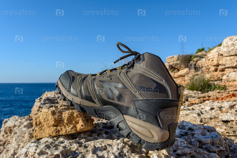 Оливково-зеленые походные ботинки на естественном фоне моря и скал