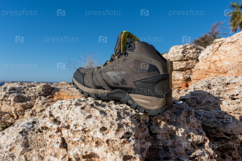 Оливково-зеленые походные ботинки на естественном фоне моря и скал