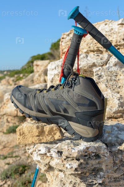 Оливково-зеленые походные ботинки на естественном фоне моря и скал