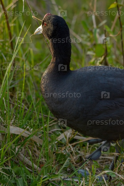 Простая лыса (Fulica atra) крупный план дикая водоплавающая птица в озере, плавание, ранняя весна, дикая природа в природном парке Майорка Испания