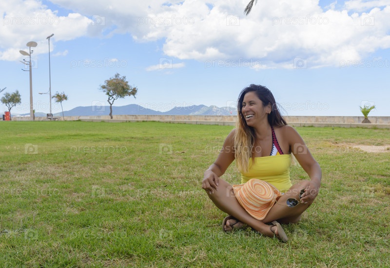 Портрет латинской женщины, улыбающейся, веселящейся, в отпуске на майорке, позирующей в теплый весенний летний день, под пальмой, праздники,