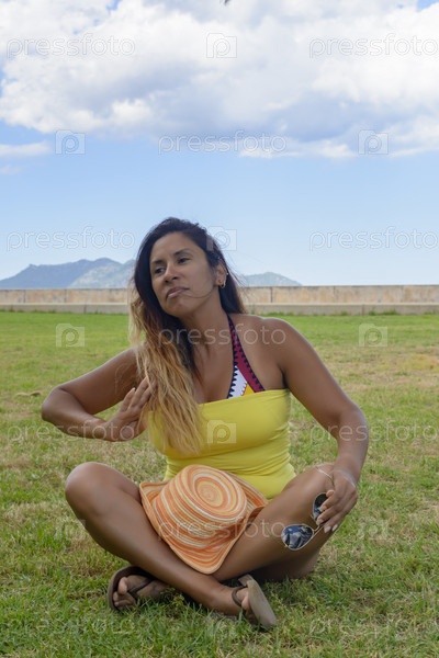 Портрет латинской женщины, улыбающейся, веселящейся, в отпуске на майорке, позирующей в теплый весенний летний день, под пальмой, праздники,