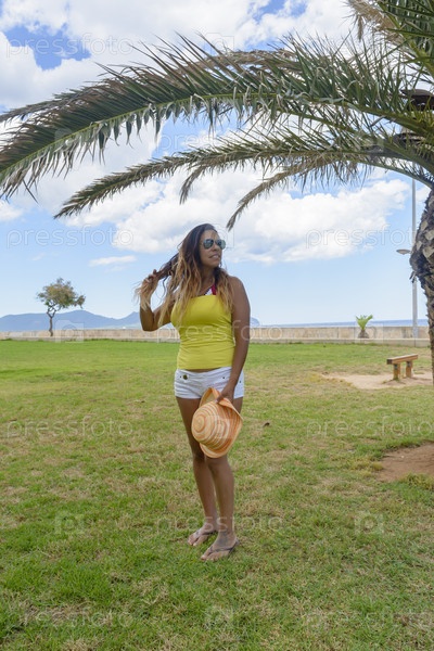 Портрет латинской женщины, улыбающейся, веселящейся, в отпуске на майорке, позирующей в теплый весенний летний день, под пальмой, праздники,