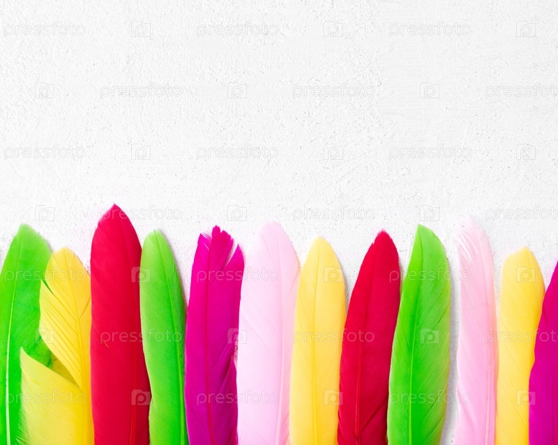 Фон с разноцветными окрашенными перьями подряд на белом. Вид сверху. Макет с копией пространства