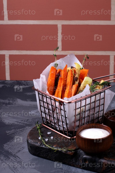 Запеченный сладкий картофель и палочки из цуккини с тимьяном и специями подаются в проволочной корзине на деревянной доске. Здоровая закуска и альтернатива фаст-фуду