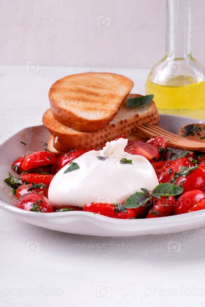 Сыр буррата с помидорами черри в салатной заправке с базиликом, чесноком и оливковым маслом, подается с поджаренным хлебом на тарелке. Средиземноморская кухня