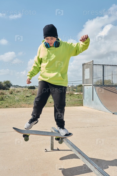 Молодой, подросток, со скейтбордом, сидящим на дорожке, в наушниках