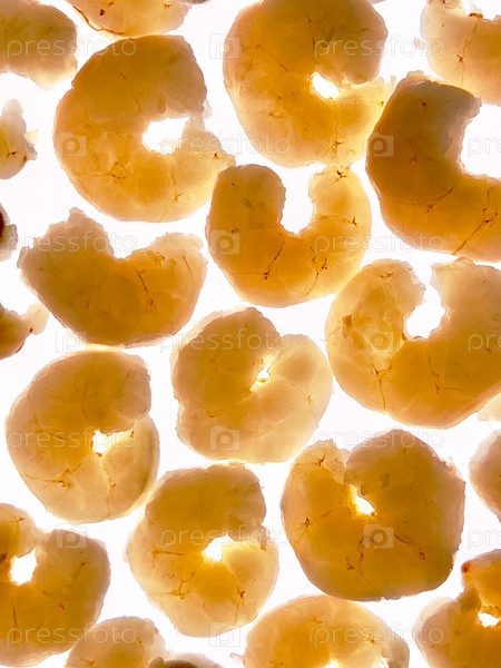 Вареные и очищенные креветки лежат на белом фоне на просвете