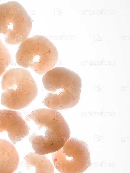 Вареные и очищенные креветки лежат на белом фоне на просвете