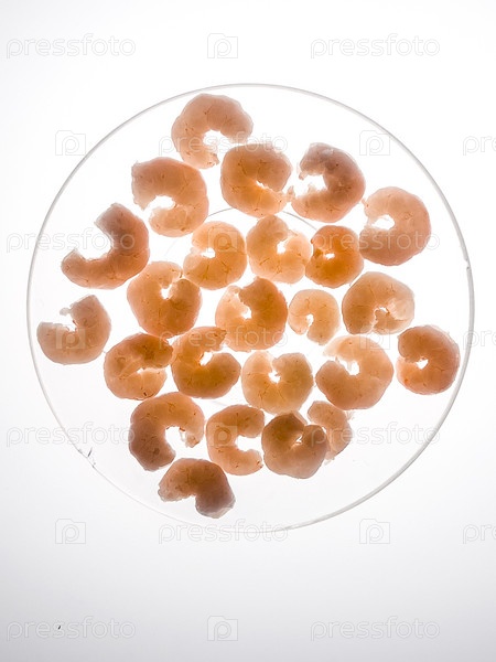 Вареные и очищенные креветки лежат на белом фоне на просвете