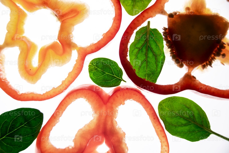 Ломтики нарезанного красного сладкого перца и огурцов, доставленные в просвет