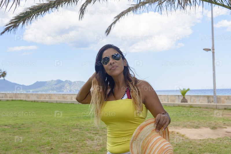Портрет латинской женщины, улыбающейся, веселящейся, в отпуске на майорке, позирующей в теплый весенний летний день, под пальмой, концепция праздников