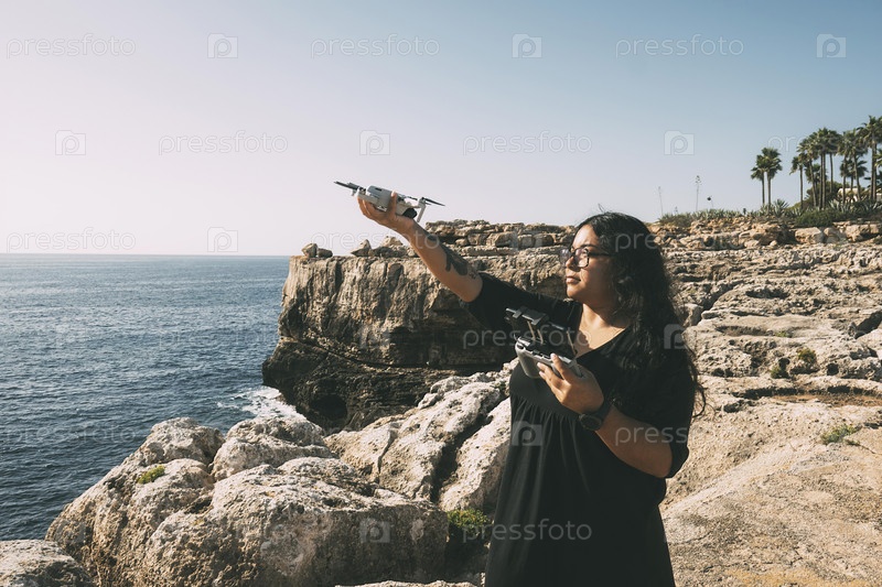 Счастливая женщина с дроном, смотрящая в сторону, черное платье и пульт дистанционного управления, на скале, у моря в солнечный день. технологическая концепция,