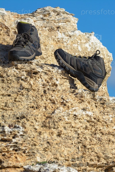 Оливково-зеленые походные ботинки на естественном фоне моря и скал