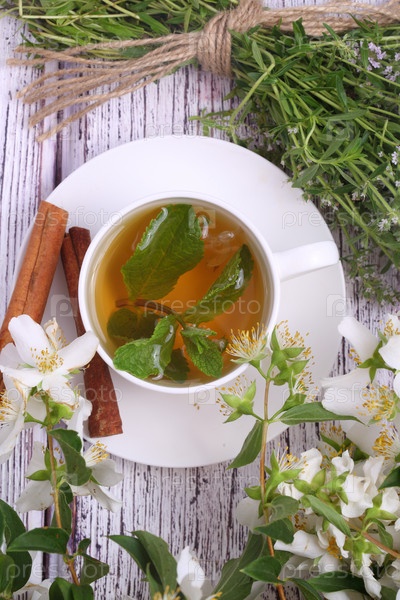 Чай с шалфеем,мятой на белом фоне